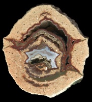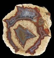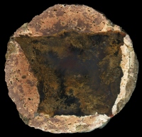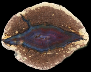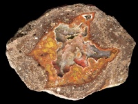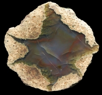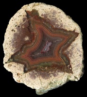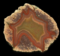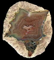 This location is famed for its vivid red colour. Nothing can come close to the St Egidien agates for their red hot warmth and these agates just love to be photographed. Cameras really go nuts over these colours, giving results that blaze with glory but are perhaps less than realistic. Hence, the main shots here are scanned. There is a distinct gradation of form as the stones get larger. The smaller stones tend to be star-shaped - round thundereggs with a classic core of agate and/or crystal. However, when they get larger, they begin to form into something very distinctive. The big St Egidien stones are characteristically elongated and shaped like an eye, with an end to end fissure of agate. Perhaps unusually, the big St Egidiens are less untidy than the smaller ones! In most stones, the bigger they are, the more room there is for irregularity and 'imperfection' - but here, there is a wholeness and substance that the small ones almost never have. Fantastic things! I quickly nicknames the big stone the 'St Egidien Eyes'. They are not particularly rare, offered for sale quite frequently at various prices - but these big stones have a real presence. Possibly the most dramatic specimens that Germany produces.