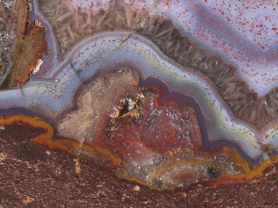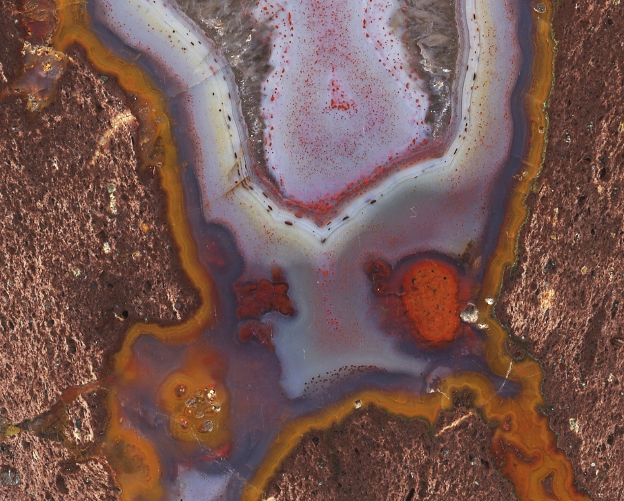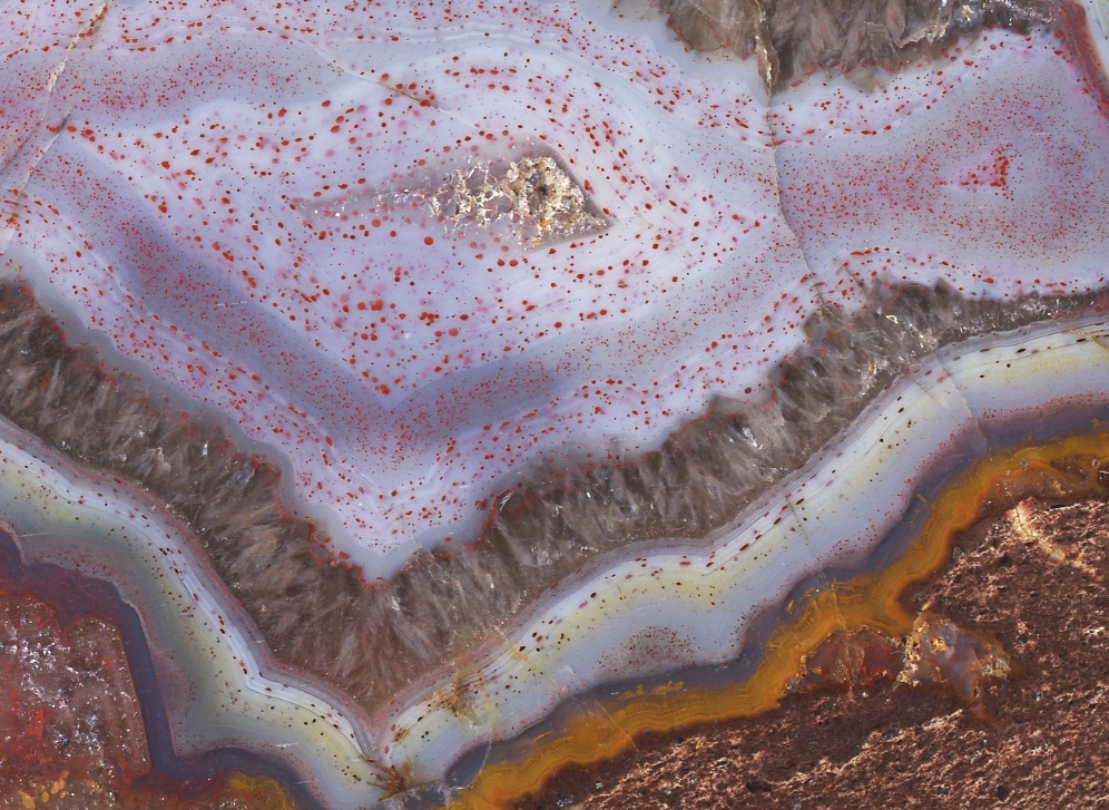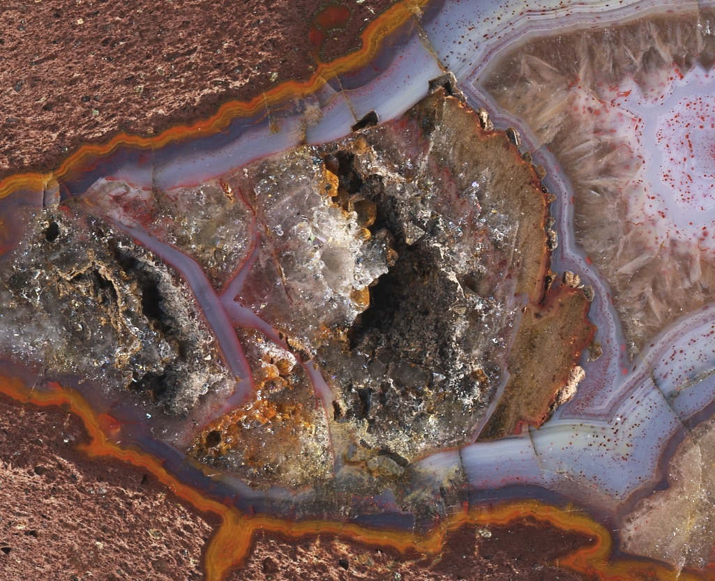 And this monster is even larger. It also features the layered nature of the really large St Egidien stones, this time with a beautiful centre of creamy agate speckled with the classic St Egidien red flecks. The decayed/crystalline area on the left is interesting in that it seems to speak of different times. One of the bands of agate passes right through it while others frame it or seal it off.