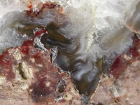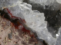 An outstanding example of a crystalline geode thunderegg. This Mexican egg almost looks edible, as though you could eat it with a spoon. It is filled with soft and succulent looking crystal, which is surrounded by a band of agate that resembles nothing so much as strawberry jam - The whole encased in a soft looking brown and tan outer matrix.