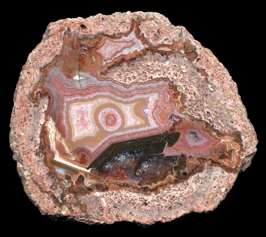 David Rix - Yes - these calcite holes are very common in Felsenschlag, Esterel etc around Europe as well - in this case though something further seems to have happened to the agate that surrounded it since it has morphed or stained into this weird black texture. You cant see it clearly in the pic because it is too small, but there are distinct fortification lines within the black. Dunno whether the rot corrupted the agate, whether whatever was there before caused the agate to form like that originally or if something else came along later - all good fun speculation!