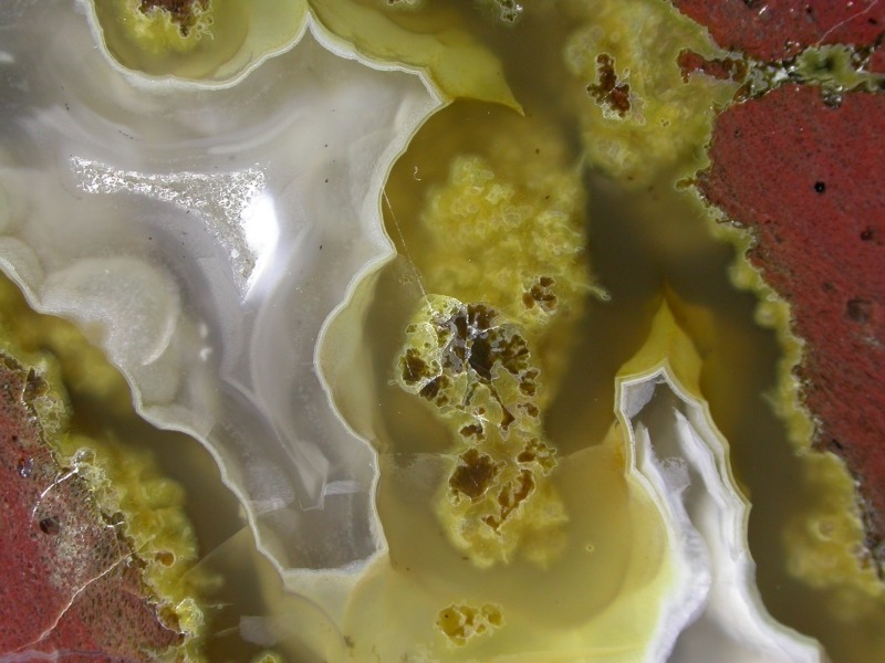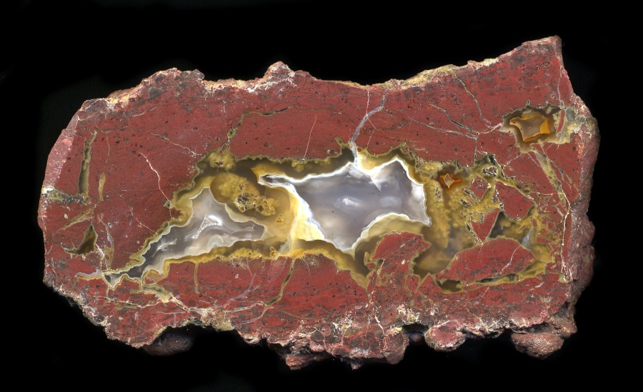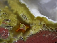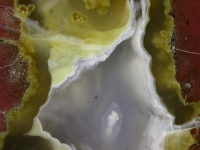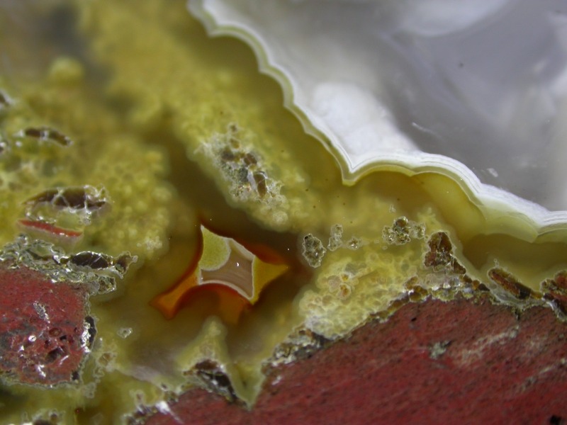 This striking and colorful thunderegg has a brick-like shape that I haven't seen very often. It is also brick red in color, with clear and transparent yellow agate, hints of fluffy golden moss and a very tiny druse crystal cave.